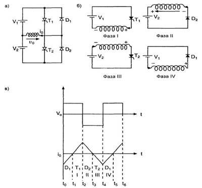 Фаза IV. На индуктивной нагрузке изменяется полярность напряжения, но направление тока через нее сохраняется. За счет изменения полярности напряжения диод D1, смещается в прямом направлении. Ток теперь течет по направлению к источнику питания Vv, имеет место рециркуляция мощности. Этот процесс продолжается до тех пор, пока диод D1 не перейдет в закрытое состояние в момент времени t5. Если тиристор Т1 снова включить, вышеупомянутые процессы повторятся.