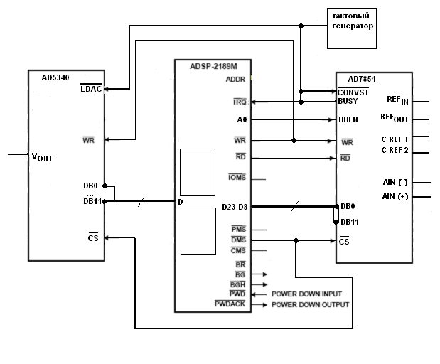 Схема стандартного интерфейса между DSP-процессором и параллельным периферийным устройством (например ЦАП) показана на рис. 14.