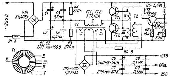 После выпрямления диодным мостом VD1 сетевое напряжение фильтруют конденсаторы С1—С4 (см. схему). Резистор R1 ограничивает ток зарядки конденсаторов фильтра, протекающий через диоды выпрямителя при включении блока. Отфильтрованное напряжение поступает на преобразователь напряжения, построенный по схеме полумостового инвертора на транзисторах VT1, VT2. Преобразователь нагружен первичной обмоткой трансформатора Т1, преобразующего напряжение и гальванически развязывающего выход блока от сети переменного тока. Конденсаторы С3 и С4 препятствуют проникновению в сеть ВЧ помех от блока питания. Полумостовой инвертор преобразует постоянное напряжение а переменное прямоугольной формы с частотой 27 кГц. Трансформатор Т1 рассчитан так, что его магнитопровод не насыщен. Автоколебательный режим работы обеспечен цепью обратной связи, напряжение которой снимается с обмотки , III трансформатора Т1 и подается на обмотку I вспомогательного трансформатора Т2. Резистор R4 ограничивает напряжение на обмотке I трансформатора Т2. От сопротивления этого резистора зависит в определенных пределах частота преобразования (см. примечание в конце страницы). Подробно о работе преобразователей с ненасыщающимся трансформатором можно прочесть в [2].