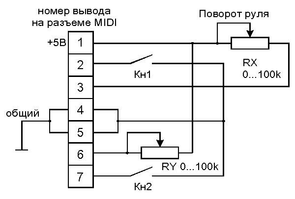 Сопротивление переменного резистора от 100 до 220 кОм - обязательно с линейной характеристикой типа "А" У меня стоит 100 кОм. RY - можно тоже использовать для управления газ-тормоз, хотя он нужен в любом случае при калибровке. В "Настройках" в "Панели управления" в "Игровых устройствах" в Windows'е добавить устройство "Джойстик 2 оси и 2 кнопки". Там же можно провести калибровку. В игрушке выбираешь пункт управление джойстиком. В любом случае в каждой игрушке есть калибровка джойстика (в частности в NeedForSpeed 1 она есть). Единственная проблема которая у меня возникла - это когда включаешь управление в игрушке на джойстик - переключение по пунктам тоже осуществляется этим джойстиком, поэтому стоит чуть-чуть повернуть руль от среднего положения и курсор сразу начинает летать по всем пунктам. И вообще при калибровке заметны колебания курсора, которые впрочем во время игры абсолютно ни на что не влияют. Причем я так думаю, что проблема именно в моей звуковой карточке, так как она сама по себе очень сильно шумит (самая дешевая, что поделаешь). Думаю, что при хорошей карточке таких проблем не будет вообще.